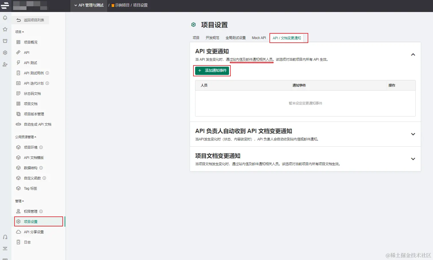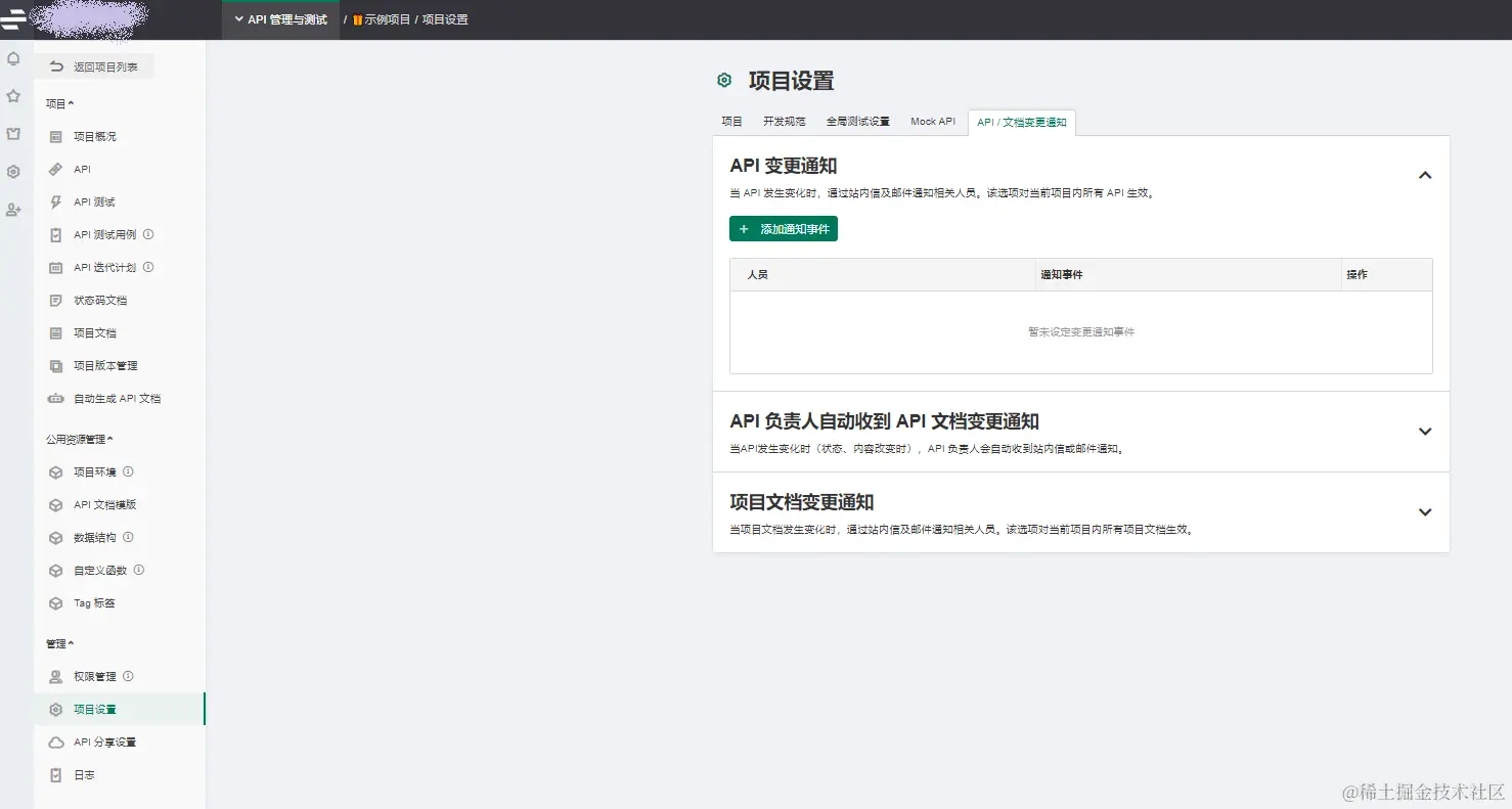 2、项目通知 还可以在项目设置 - API / 文档变更通知 – 添加通知事件 进行批量的项目API变更通知