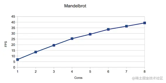 下图显示了不同核心数对应的帧率(FPS,每秒帧数)。我们使用的是一台 late-2013 的 MacBook Pro,有四个超线程核心(hyperthreaded core),浏览器是 Firefox 46.0。