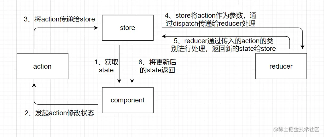 - 通过 store.dispatch(action) 发起修改,store 会调用 reducer 函数,reducer根据会根据action和当前的state返回一个新的state