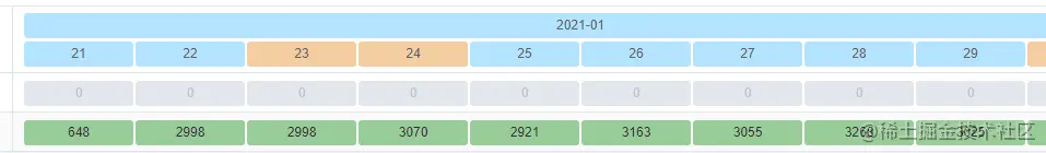 需求是日期挪移到表头,第一行显示年月,第二行显示日,周末高亮