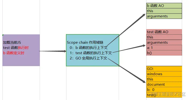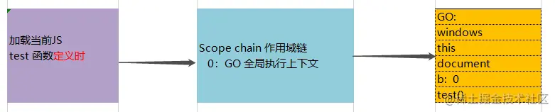 作用域:b 函数的作用域是 b 函数的 --- 我们只分析当前 b 函数 作用域链:b()的AO --- test()的AO --- Go