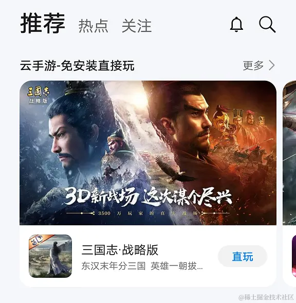 而在云游戏方面,在5G技术的推动下,云游戏开始进入快速发展期,逐渐实现在低性能设备及手机上畅玩配置要求较高的重度游戏,为用户带来更好的游戏体验。华为游戏中心内的“云手游”专区为游戏玩家提供了多款云游戏,年度游戏中上榜的《三国志·战略版》也在其中。这种免安装、直接玩的游戏方式无疑将成为未来的游戏趋势之一。