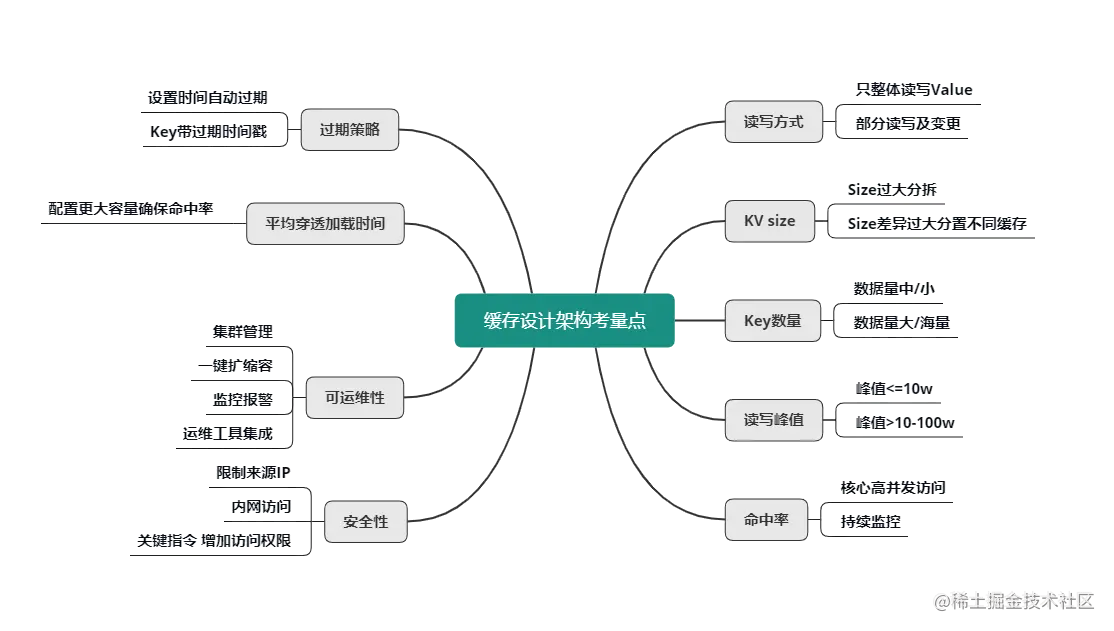 在缓存设计架构的过程中,有一些非常重要的考量点,如下图所示,只有分析清楚了这些考量点,才能设计架构出更佳的缓存体系。