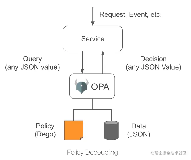 Open Policy Agent(即OPA, CNCF孵化项目), 为策略决策需求提供了一个统一的框架。它将策略决策从软件业务逻辑中解耦剥离,将策略定义、决策过程抽象为通用模型,实现了一个通用策略引擎,