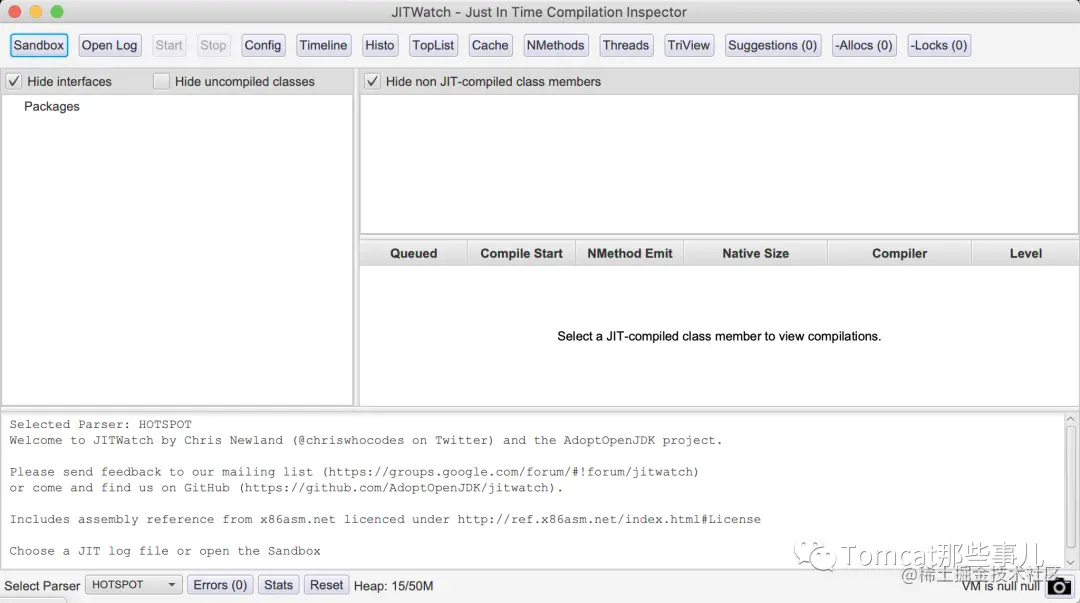 JITWatch 还有一个沙箱的环境,可以用来实验观察 JIT的行为,观察 JVM 里JIT的决策过程。