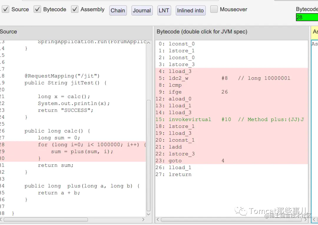 在点击右侧某个JIT编译过的具体方法后,点击TriView,会看到生成的节字码,以及相应的源码是如何对应到字节码和汇编代码的。