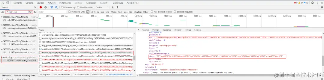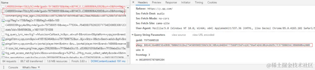 它的参数部分有一个 vkey 的参数,把 vkey 当作关键字在 Network 面板中搜索,找到一个 musics.fcg 结尾的链接,vkey 的数据就在它返回的 json 串中,另外的 purl 的值就是上面的 m4a 链接,最后将 ws.stream.qqmusic.qq.com 和 purl 拼凑成音乐链接,musics.fcg 链接中 guid 参数是一个随机数,songmid 参数是上面单个音乐的 songmid,uin 参数是 QQ 号\