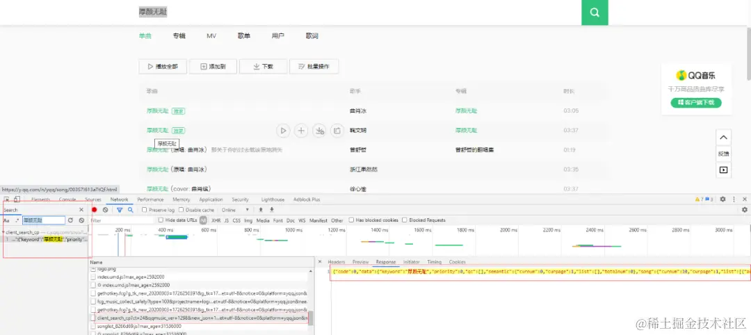以下载 QQ 音乐为例,在首页(y.qq.com/) 上的搜索框中搜索 <<厚颜无耻>>, 打开 F12 的控制台面板,可以找到如下图的搜索链接,这个链接返回的是一个音乐列表的 json 串