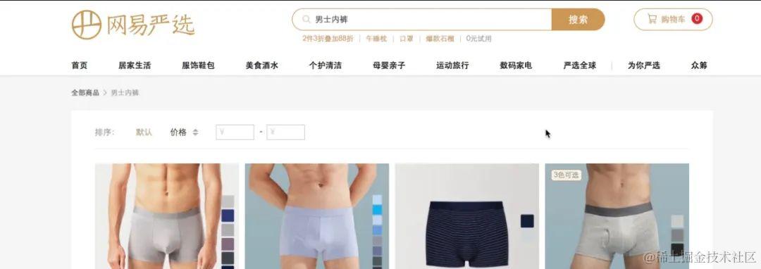 首先,我们在网易严选的搜索框输入关键词“男士内裤”,页面搜索出来男士内裤的产品列表界面: