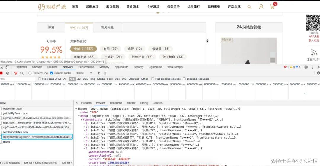 我们分析请求列表,就可以很容易地发现评论数据是通过 you.163.com/xhr/comment… 这个请求来获取的。然后我们过滤请求参数,去掉不是必传的参数,最终发现 itemId 和 page 两个参数是必须的。
