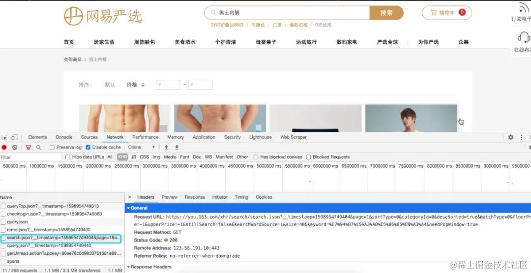 同样的,我们在搜索界面的请求分析中,找到了 you.163.com/xhr/search/… 这个请求,逐个分析请求参数后发现,我们只需要 keyword 和 page 两个参数即可。