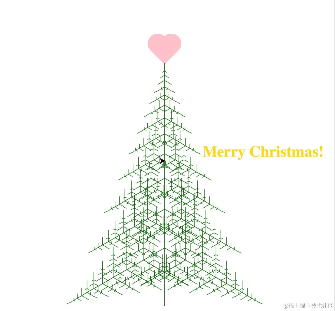 爱心画完了,就要开始画圣诞树了,我们知道,圣诞树从树顶往下是一个对称的锥形,这么规则的形状,正是我们想要的,它简化了我们程序的逻辑。我们先画树的主干,然后再画小树枝,小树枝采用从上到下一层一层画的模式,每一层左右对称,并且画法相同,采用递归的方式来实现: