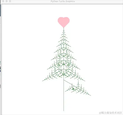 本文想通过 turtle 动态画图,向观看对象呈现一个动态绘制礼物的过程。一提到圣诞节,大家映入脑海中的肯定就是郁郁葱葱的绿色圣诞树,如果只是一棵圣诞树,未免也太平平无奇了,所以我准备在圣诞树的顶部加一颗爱心,来起到画龙点睛的作用。