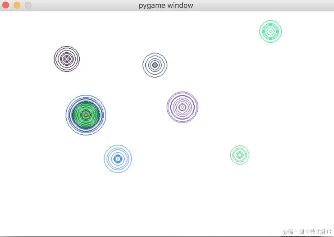 基于这样的思路,我想起了以前在哪里看过的一个小游戏————七彩同心圆。它的玩法就是每次点击鼠标时,会以鼠标为圆心画一个圆,然后在这个圆的基础上不断向外扩展圆(类似于水波浪的扩散),从而形成一个同心圆,并达到随机大小后停止扩展,其中每个同心圆的颜色都是随机的。