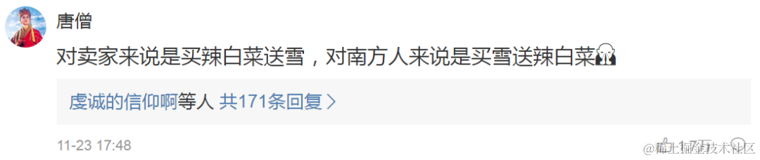 此事还上了微博热搜,博主唐僧评论:“对卖家来说是买辣白菜送雪,对南方人来说是买雪送辣白菜”,网友 melodyming2 回复:“圣僧我悟了”,大家如果有兴趣的话,可以到网上看一下详细报道,这里就不多说了。