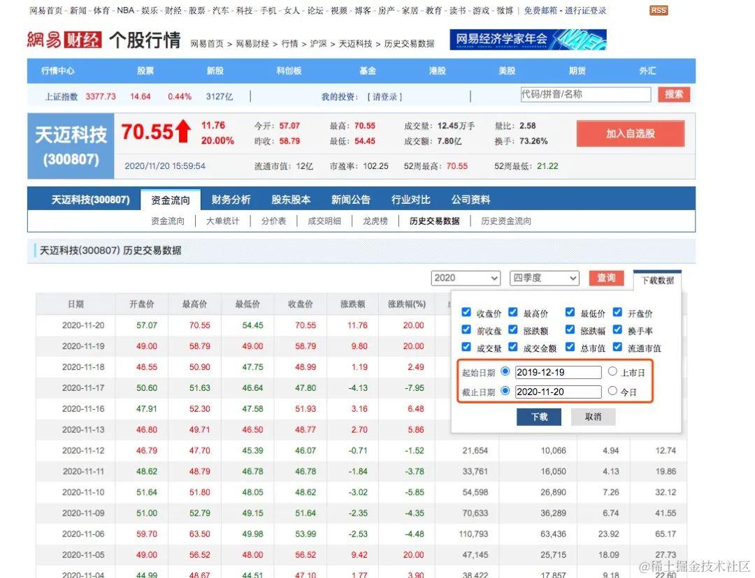 哇!我看到了起始日期和截止日期,选择开始日期和截止日期,就可以下载一只股票的所有历史交易数据,so easy~