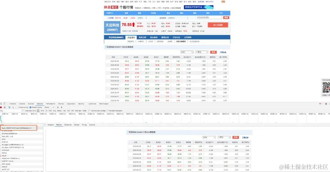 既然“下载数据”这个入口已经不适合程序操作了,那我们回到股票详情页面,这个页面是按照季度来查询历史交易数据的,那我们把这个页面的数据解析出来,不就获取了这只股票一个季度的数据了吗?然后写个循环,逐个季度获取,不就完事了吗?