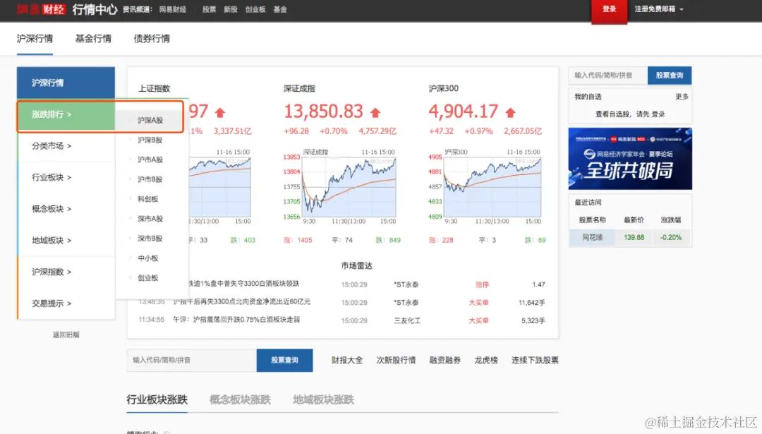 然后在这个页面的左侧导航栏中找到“涨跌排行”栏目,点击选择“沪深A股”,如下图所示: