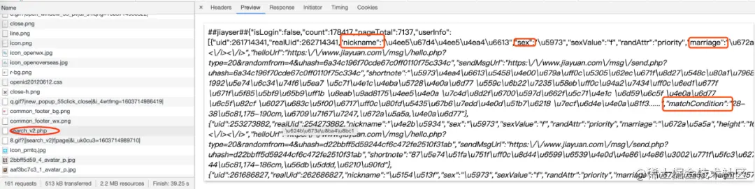 翻了几页找到一个 search_v2.php 的链接,它的返回值是一个不规则的 json 串,其中包含了昵称、性别、是否婚配、匹配条件等等