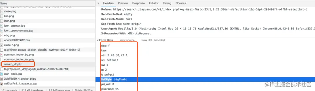 点开 Hearders 拉到最下面,在它的参数中 sex 是性别、stc 是年龄、p 是分页、listStyle 是有照片\