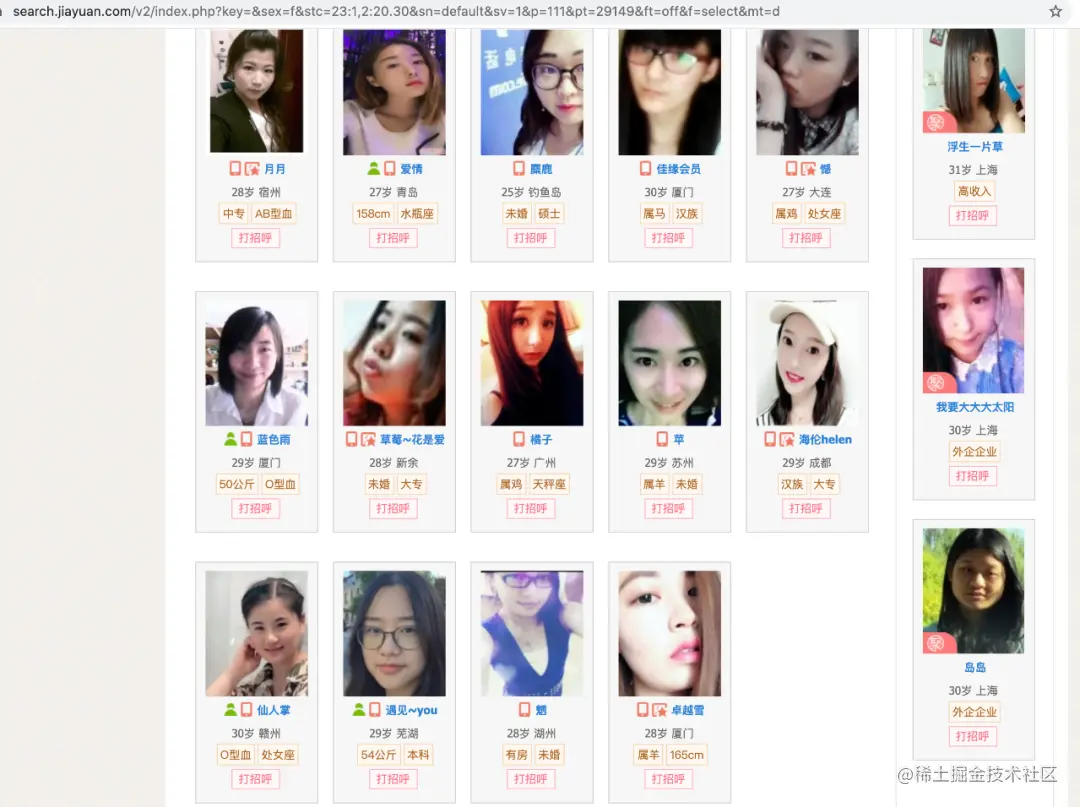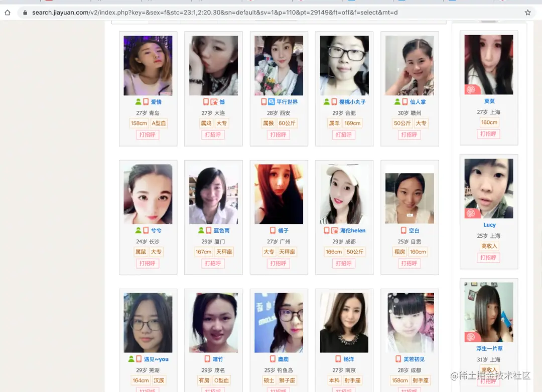 url = 'http://search.jiayuan.com/v2/search_v2.php?key=&sex=f&stc=23:1,2:20.30&sn=default&sv=1&p=' + str(i) + '&f=select&listStyle=bigPhoto'