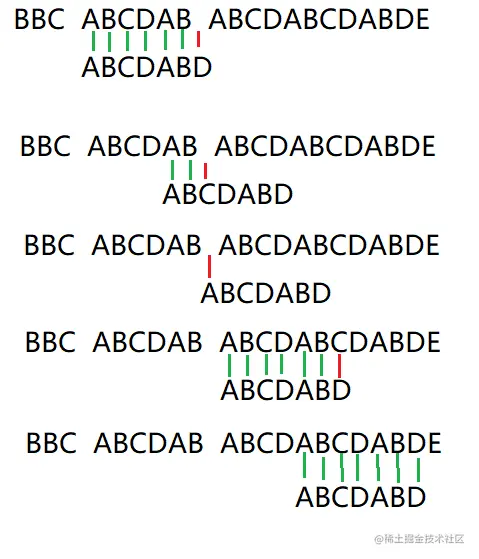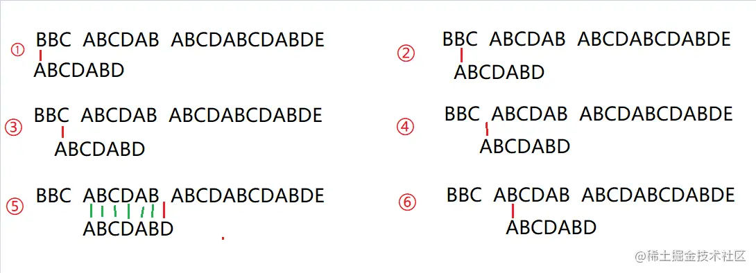 针对上面给定的T串与P串,采用暴力方法前几步如下: