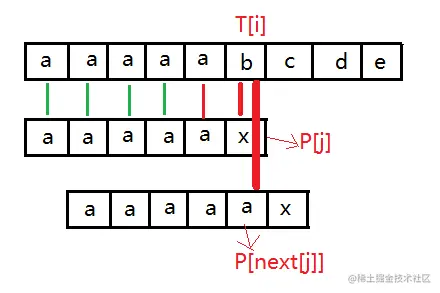 最坏的情况:O((n-m+1)*m) T:aaaaaaaaaaaaab P: aaab 每次都到最后一个才失败,总比较次数(n-m+1)m