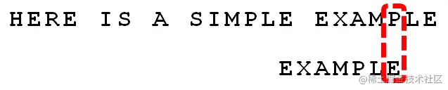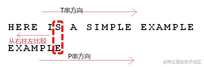 依然从尾部开始比较,发现"P"与"E"不匹配,所以"P"是"坏字符"。但是,"P"包含在搜索词"EXAMPLE"之中。所以,将搜索词后移两位,两个"P"对齐。