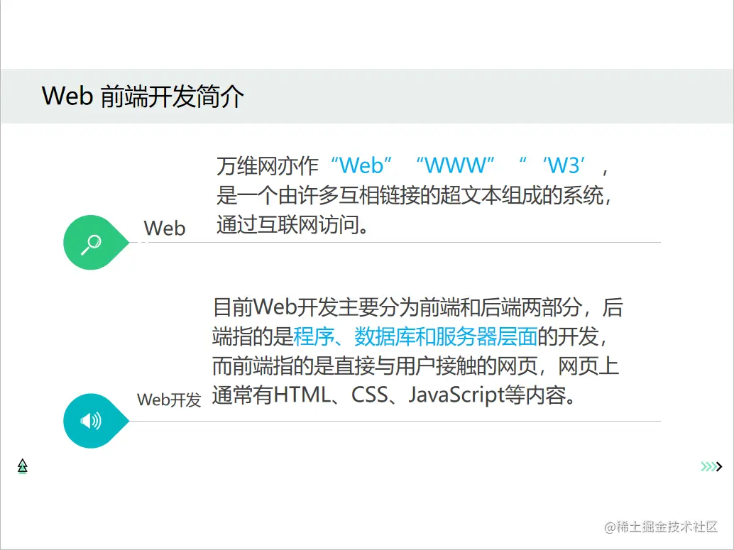 而web开发目前主要分为前端和后端两部分,后端指的是程序、数据库和服务器层面的开发,而前端指的是直接与用户接触的网页,网页上通常有HTML、CSS、JavaScript等内容。