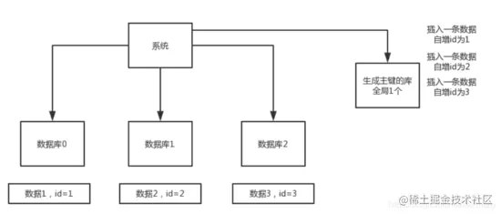 数据库自增ID:在分库分表表后使用数据库自增ID,需要一个专门用于生成主键的库,每次服务接收到请求,先向这个库中插入一条没有意义的数据,获取一个数据库自增的ID,利用这个ID去分库分表中写数据。优点:简单易实现。缺点:在高并发下存在瓶颈。系统结构如下图(图片来源于网络)