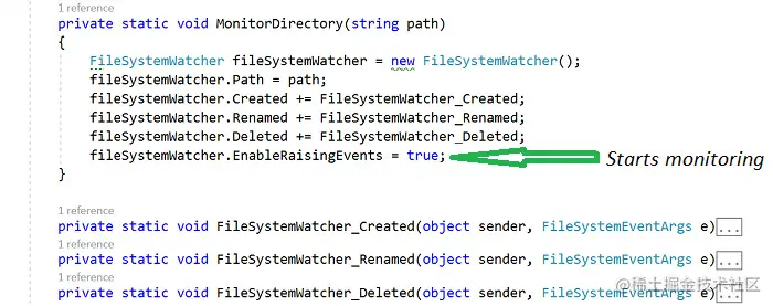 下面的代码片段展示了 MonitorDirectory 方法的内部逻辑,这个方法可用于监视指定的文件夹并且当文件夹变更时触发事件,可以看到文件夹路径是通过参数传进去的。