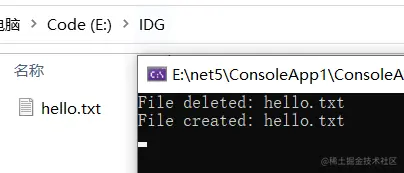 假设 IDG 文件夹是在 E 盘内,接下来把 Console 运行起来,然后在 IDG 文件夹内创建一个新文件,不出意外的话,你会观察到这个新建的文件名将会出现在 控制台 上,说明 FileSystemWatcher_Created 被成功触发,参考下图: