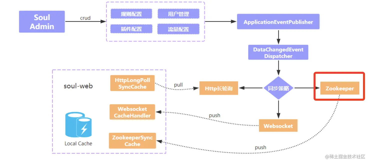 基于 zookeeper 的同步原理很简单,主要是依赖 zookeeper 的 watch 机制,soul-web 会监听配置的节点,soul-admin 在启动的时候,会将数据全量写入 zookeeper,后续数据发生变更时,会增量更新 zookeeper 的节点,与此同时,soul-web 会监听配置信息的节点,一旦有信息变更时,会更新本地缓存。