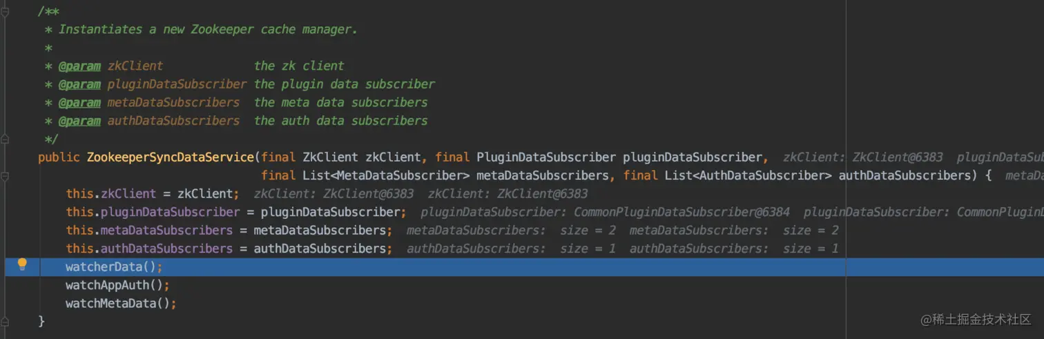 我们发现项目启动时,首先进行 ZookeeperSyncDataConfiguration 的SyncDataService 的初始化, 并进行data、appAuth、metaData的发布, 因为初始数据都为空,所以都会从zookeeper先获取初始数据并缓存到本地和zookeeper节点。