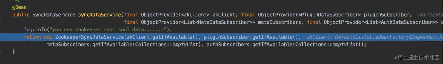 public SyncDataService syncDataService(final ObjectProvider<ZkClient> zkClient, final ObjectProvider<PluginDataSubscriber> pluginSubscriber,