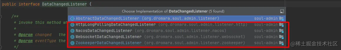 我们再回来看ZookeeperDataChangedListener这个类,这个类在项目启动的时候,并没做啥具体的事情,但是这个接口是后面增量数据更新的核心监听器。这个监听类实现了接口DataChangedListener,而这个接口看名字就知道是数据更新监听接口,看了一下这个接口在soul中的实现类,一共有四种,正好对应官方文档中定义的四种数据同步通知策略: