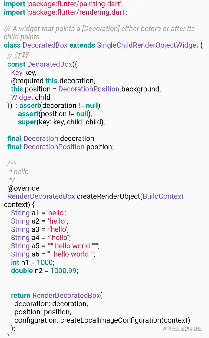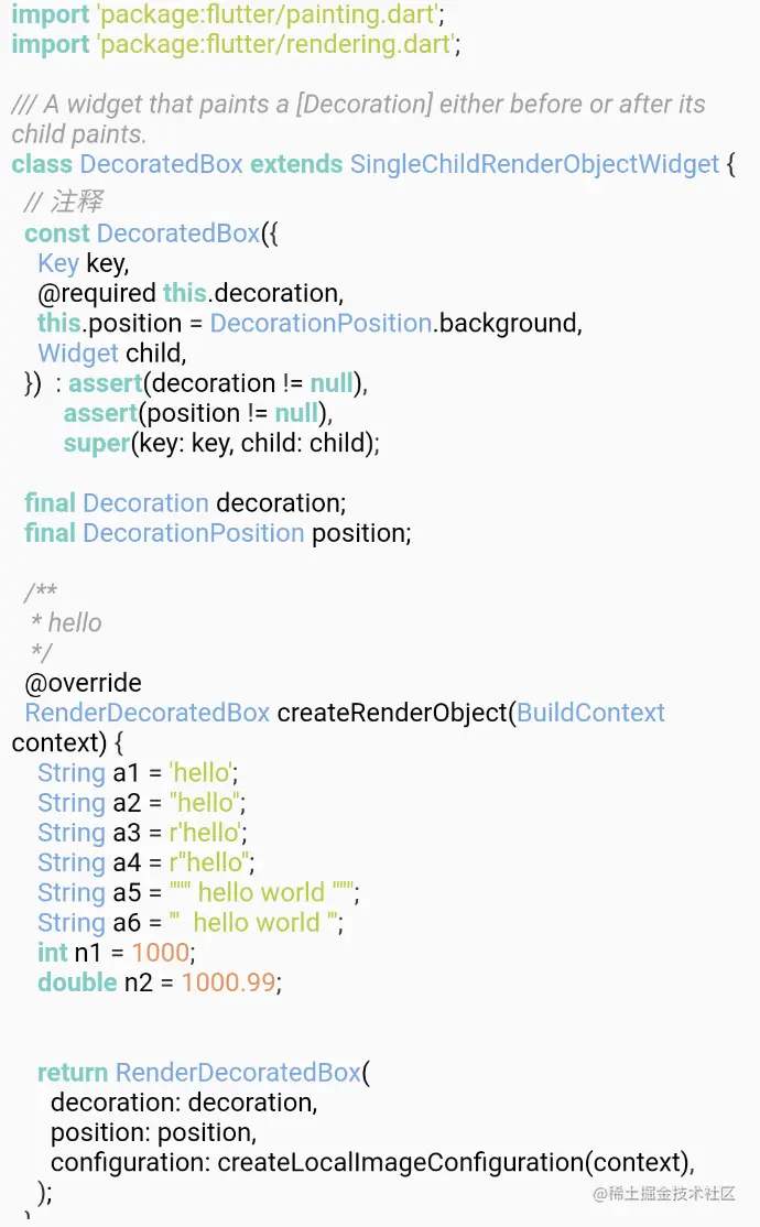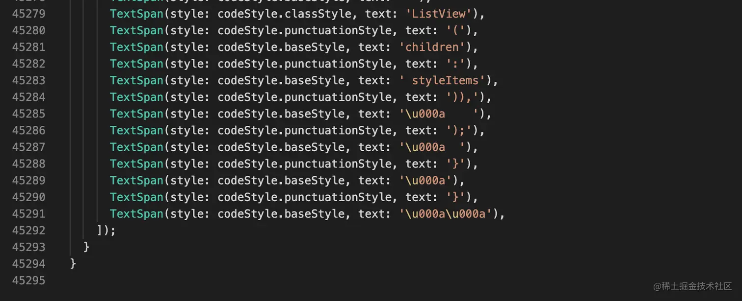 经过前面两篇的富文本介绍。已经基本上认识了 StringScanner 的使用,以前看 flutter/gallery 中有代码块的高亮功能,就研究了一下,用在了 FlutterUnit 中。目前 flutter/gallery 通过 codeviewer_cli 把所有的代码对应的 TextSpan 给直接生成了,一个 2.6 MB 的 45295 行 超大文件,并且将通过静态方法向外提供所需的 TextSpan,殊途同归吧,都是生成对应的 TextSpan 。之前的代码高亮逻辑可以查看这个包 syntax_highlighter。