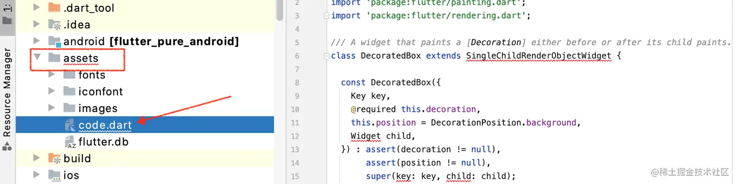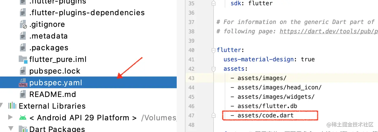 这里的测试代码字符串放在 assets 目录下。并在 pubspec.yaml 中进行配置。