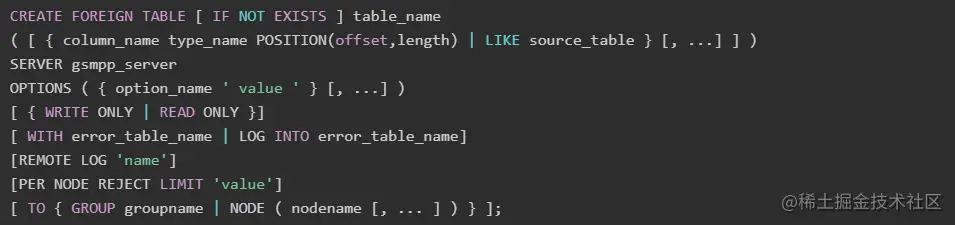 顾名思义,这个功能与数据库外部的数据有关系,对于外数据的具体描述是通过外部表来定义的。以GDS外部表创建语句为例说明外部表的结构: