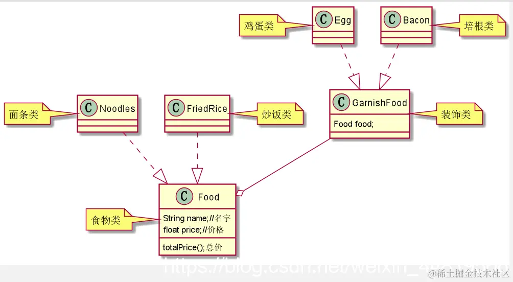 现在这个食物类就变成了被装饰者,通过鸡蛋来装饰达到’面条鸡蛋’或者’炒饭鸡蛋’的效果,鸡蛋就变成了装饰者