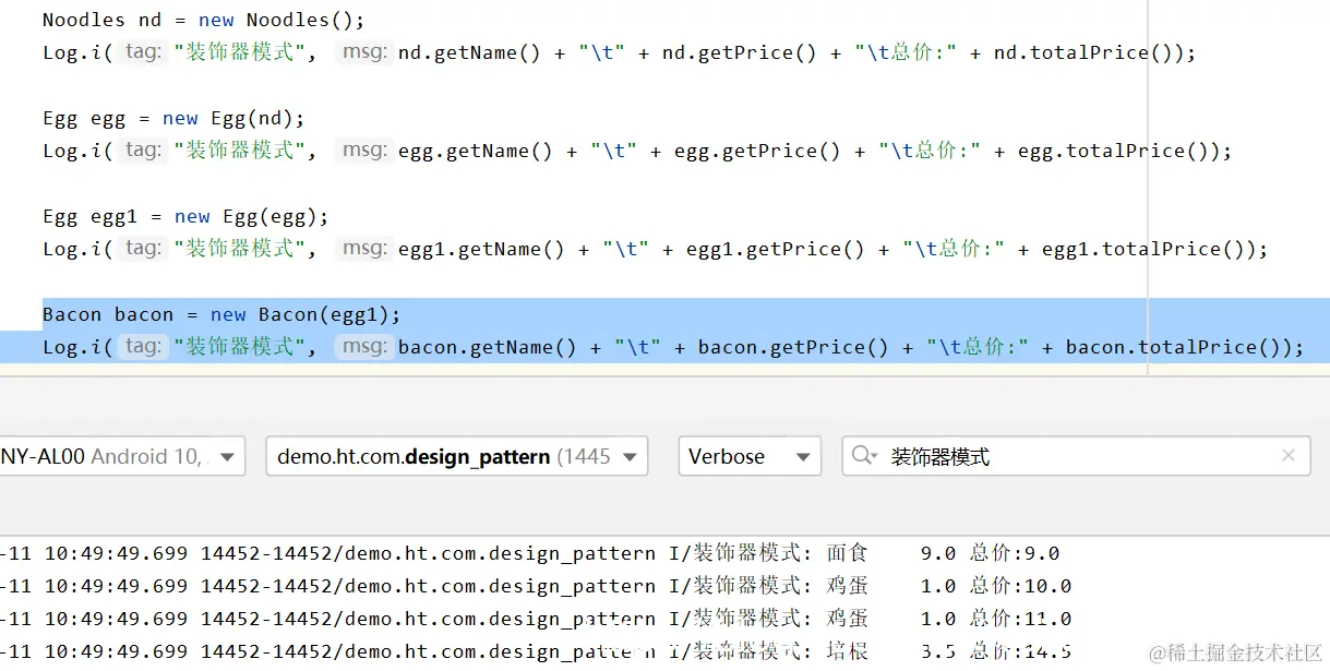 Log.i("装饰器模式", bacon.getName() + "\t" +
