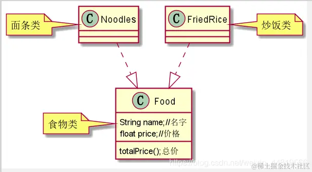 面条和炒饭都属于食物,所以都继承自食物类(Food),咋们需要在各个食物上添加一些新的产品,