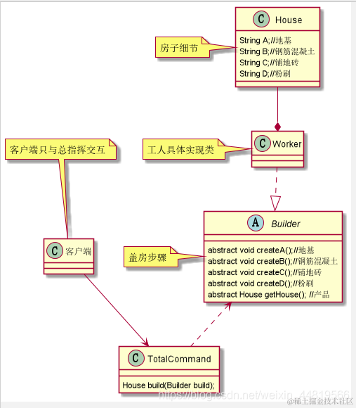- TotalCommand是总指挥,我给你房子步骤(Builder),你返回我房子(这里Worker继承自Builder)
