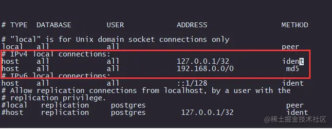 [root@localhost pgsql]# vi /var/lib/pgsql/9.6/data/pg_hba.conf
