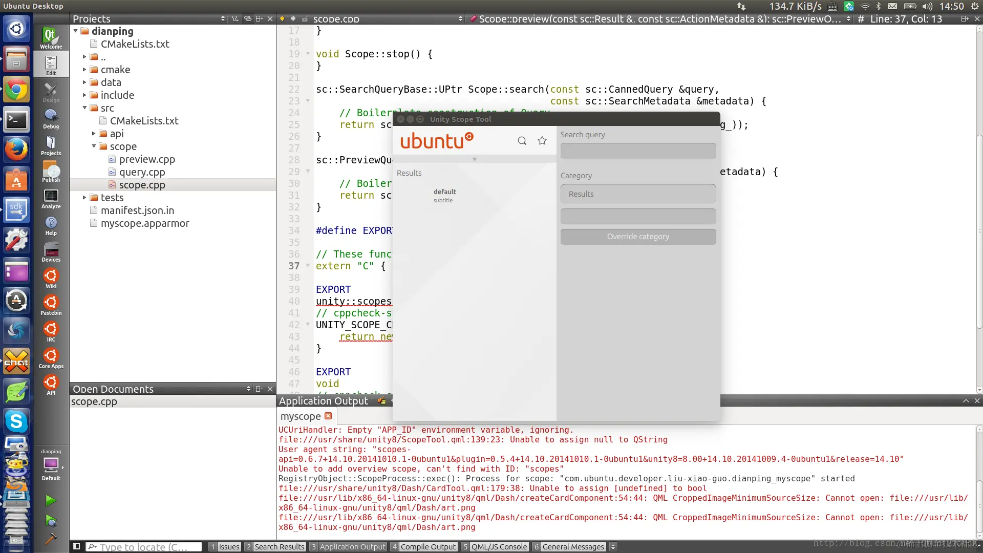 我们再重新编译我们的应用,如果我们没有错误的话,我们的Scope可以直接在desktop下直接运行。这里我们加入了一个”QCoreApplication”变量。这主要是为了我们能够使用signal/slot机制及生成一个Qt应用。我们来修改scope.h文件,并加QoreApplication的变量app及forward申明。我们也必须同时加入一个方法"run"。\