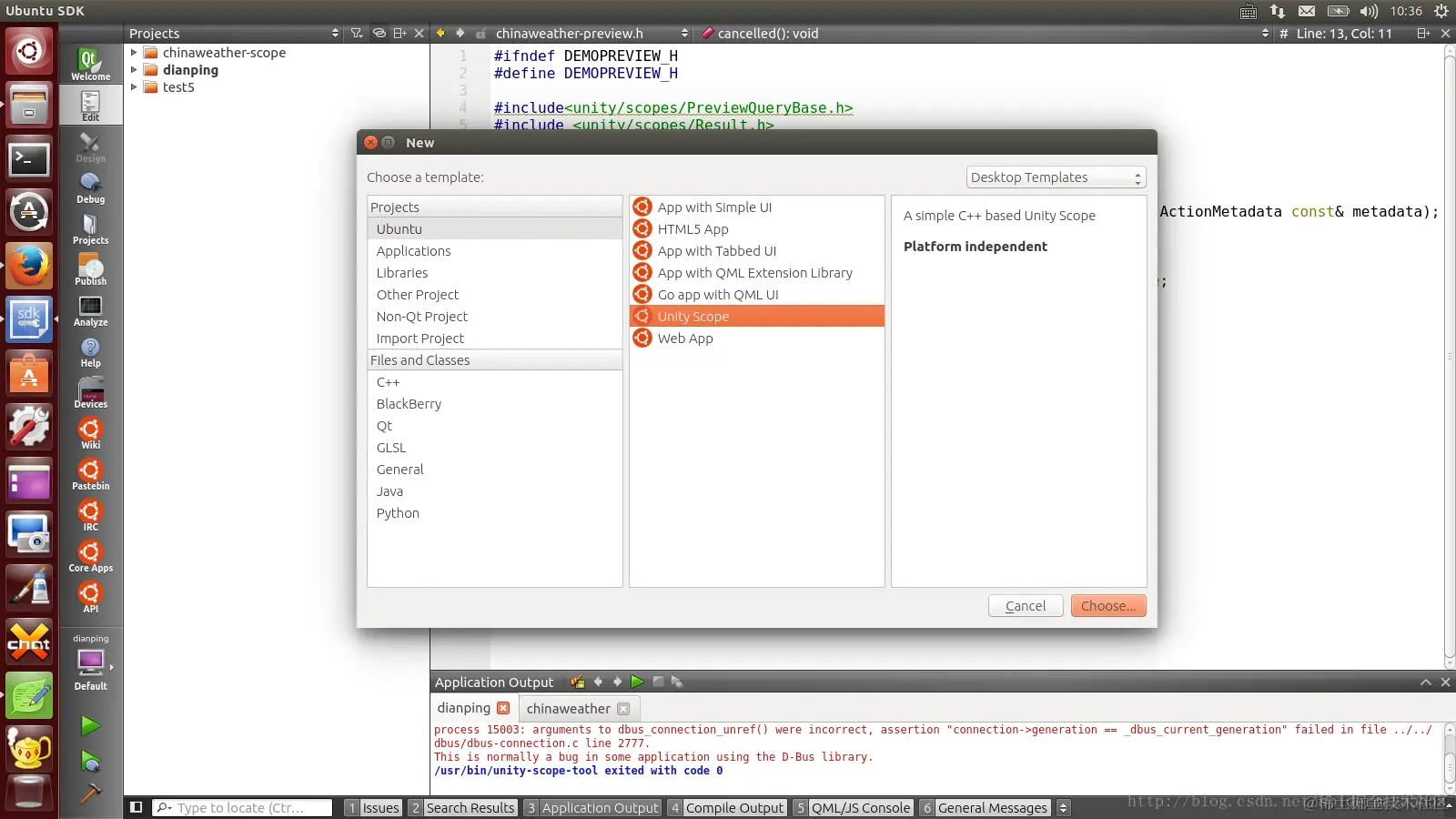 首先打开我们的Ubuntu SDK。选择“Unity Scope"模版。