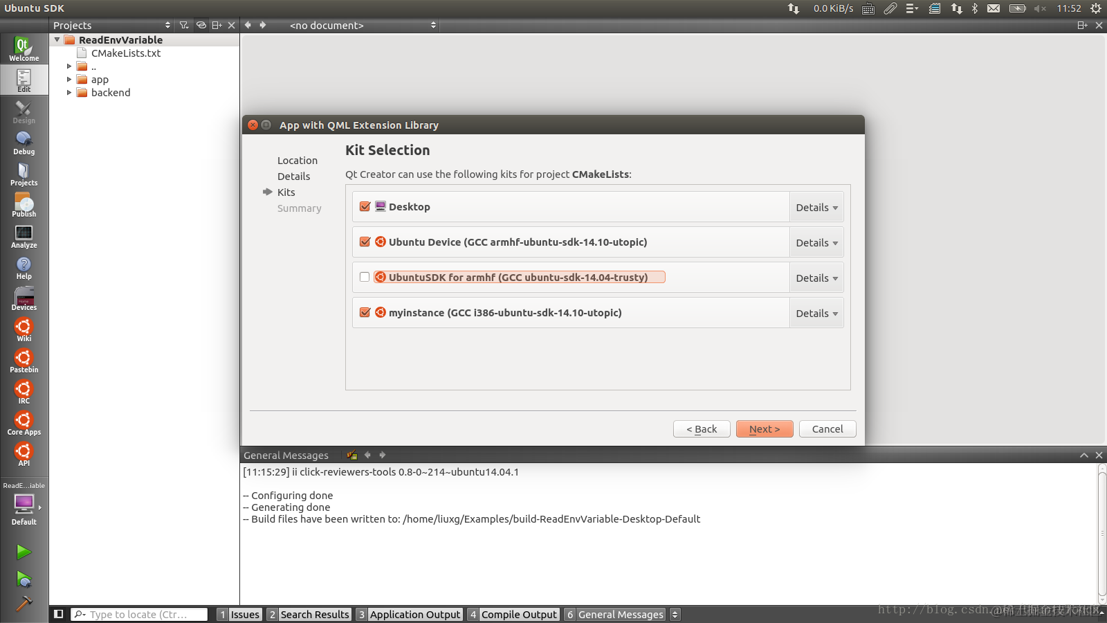 然后,我们按IDE提示的步骤完成以后的过程创建出我们的最原始的一个template应用。我们可以开始在desktop及"armhf"的环境中运行。如果我们还有问题,这可能是我们的安装程序有些问题。请参考我们的 SDK安装文章进行修正。