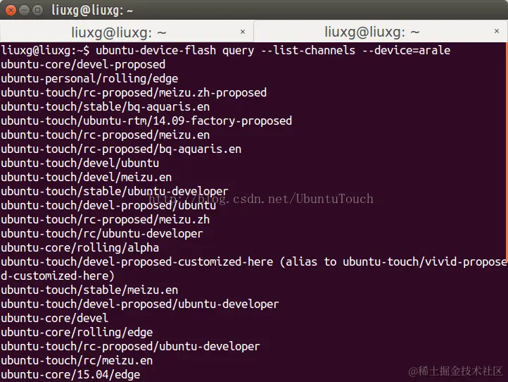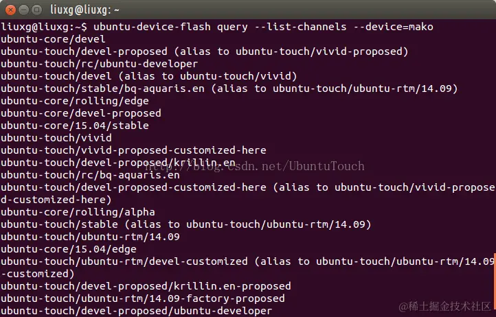 对MX 4的用户来说,我们必须确保我们的手机是解锁的才可以刷Ubuntu手机软件。从网上购买的Ubuntu手机,都是已经解锁过的。另外,我们必须像在上面介绍的那样,我们首先需要通过“ 怎么在Ubuntu手机中打开开发者模式”来打开我们的开发者模式。我们可以使用如下的命令来显示所有可以刷进MX 4的所有channel: