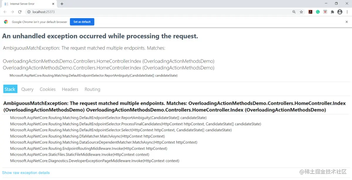注意上面类中我新增了一个 public IActionResult Index(string text) 方法,编译器没有给出任何错误提示,然而把应用程序跑起来,你会遇到一个运行时错误,如下图所示:
