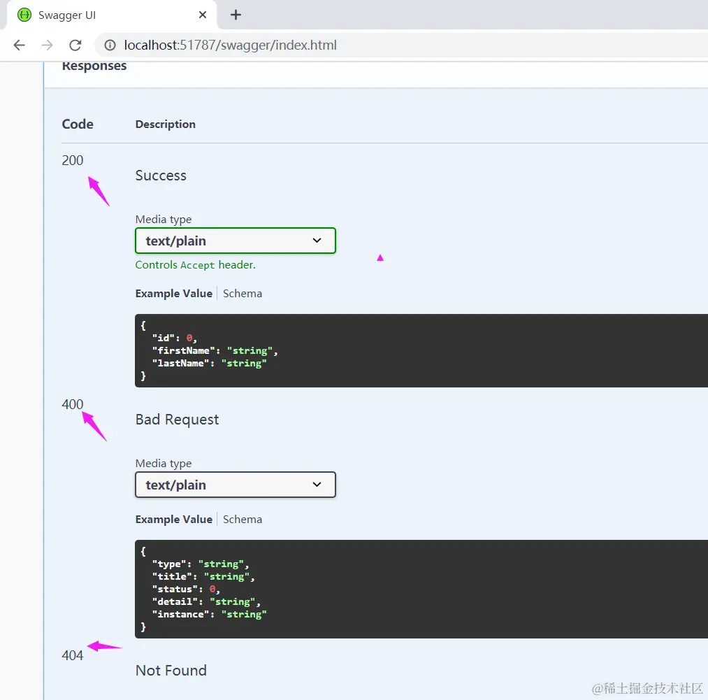 如果想让 Swagger 多列几种状态,要怎么做呢?你可以在 Action 或者 Controller 上增加几个 StatusCode 状态即可,比如 200,400 和 404 ,修改代码如下: